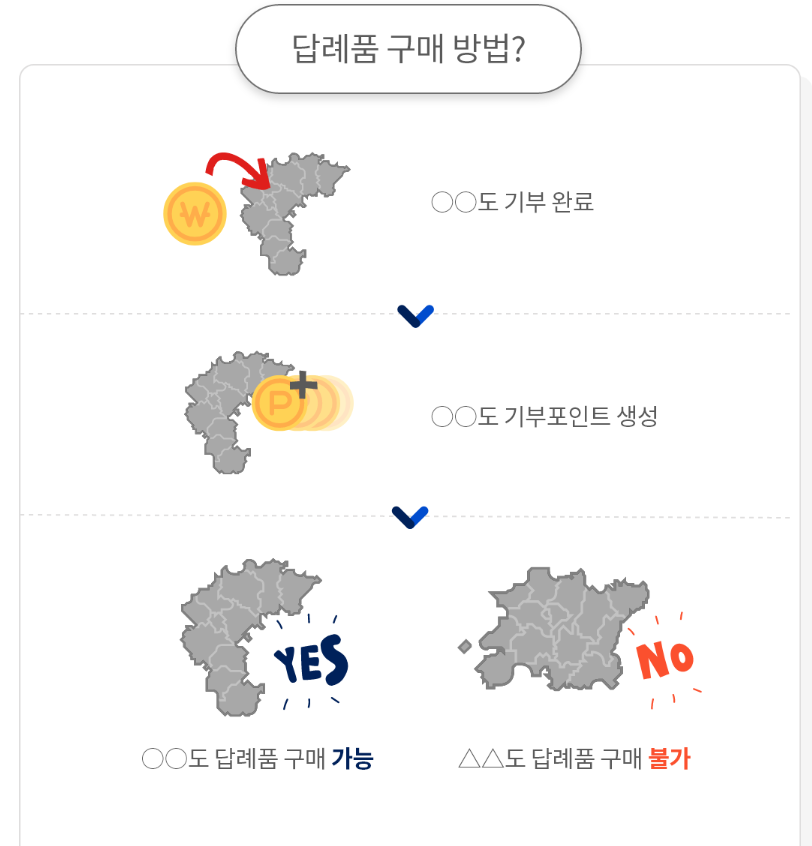 또한 기부금 30%내(최대 150만 원)의 지역 특산품이 답례로 지급됩니다. 기부자는 지급받은 포인트로 본인이 원하는 답례품을 선택하고 신청할 수 있습니다. 만약 10만 원을 기부한다면 전액을 세액공제받고, 3만 원 상당의 답례품을 받게 되어 총 13만 원의 혜택을 누리게 됩니다.(위 표 참조) 이처럼 기부자는 세액 공제 혜택뿐 아니라 원하는 답례품을 받고, 지자체는 기부금을 예산으로 활용하고 답례품 유통으로 지역발전도 도모할 수 있는 선순환의 제도라고 할 수 있습니다.