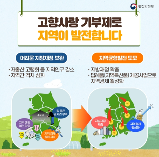 인구감소로 얼마 못 가 사라질 우리나라 도시들이 많다는 이야기 한 번쯤은 들어보셨을 겁니다. 앞서 비슷한 상황을 겪은 일본에서 아주 크게 성공한 제도인 고향사랑기부제(일본에서는 고향납세제)를 우리나라도 2023년 올해부터 실시하게 되었습니다. 고향에 기부를 하면 해당 지자체에서는 기부자에게 답례품을 제공하고 국가에서는 세액공제를 해주는 제도로 지방의 재정자립도를 높이고 지방소멸을 막고자 하는 정책입니다.